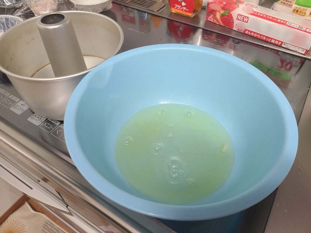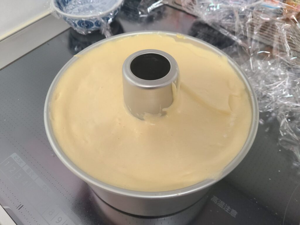 ※シフォンの容器に生地を入れていますが、この時の分は失敗しました(量がいつもより多い)。