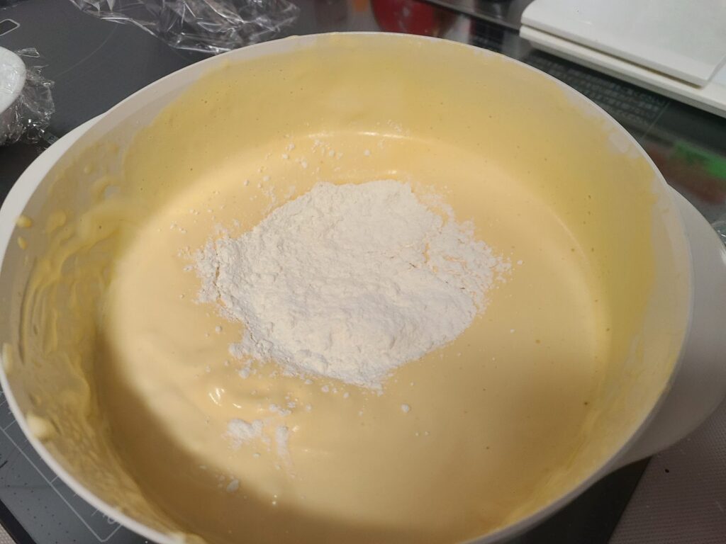 卵黄もしっかり混ぜます。卵黄にも空気を含ませると、失敗する確率が下がるような気がしています。その後、”こんな小麦粉”を、計量した分だけドバッと入れて混ぜます。