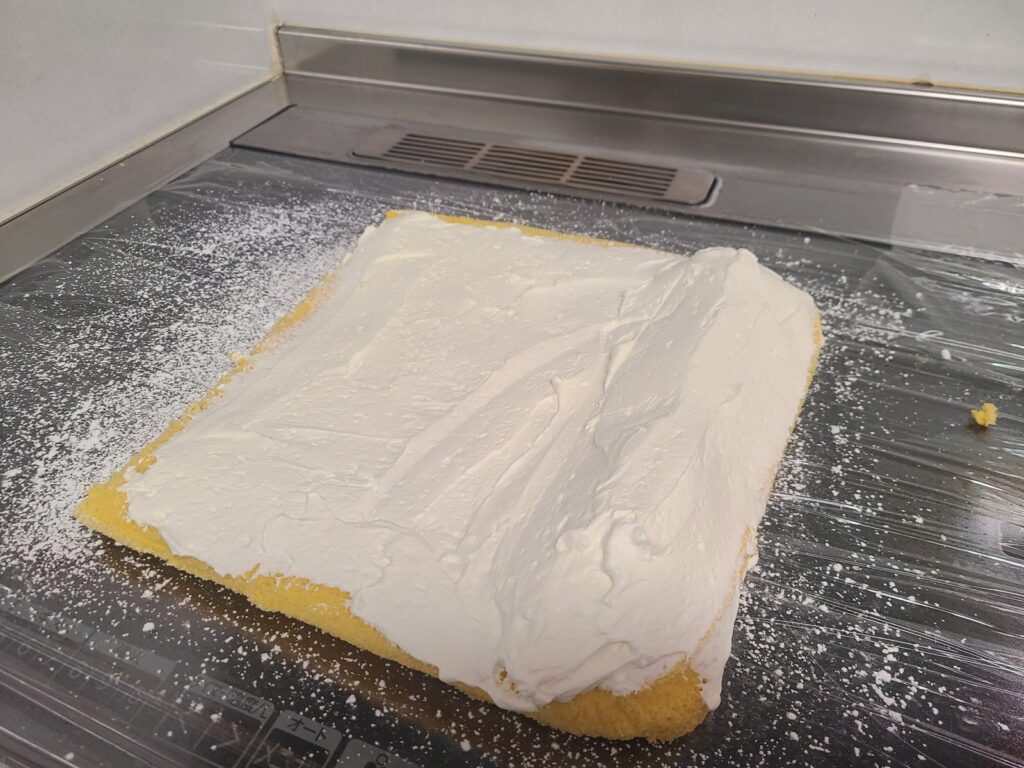 ロール生地の熱が冷めてから、生クリームを塗ります。